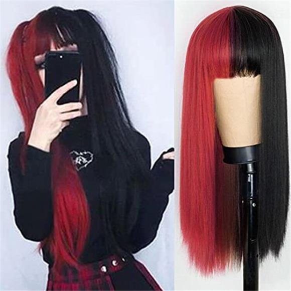 Hair Kaneles Half Red Half Black Wig Long Straight Hair With Bangs Cosplay Naturalwig Poshmark